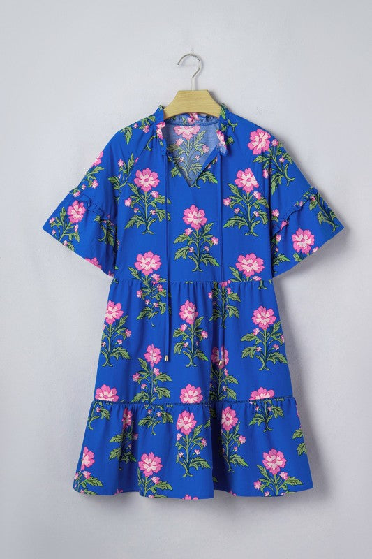 Floral Tie V-Neck Short Sleeve Mini Dress